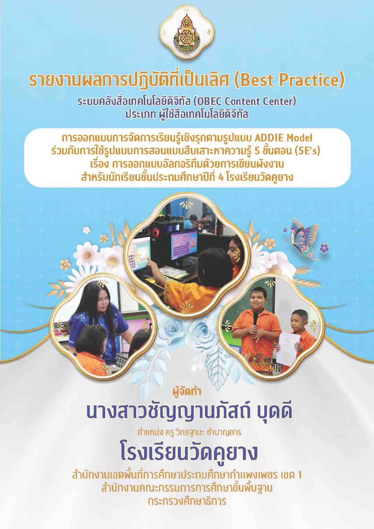 การออกแบบการจัดการเรียนรู้เชิงรุกตามรูปแบบ ADDIE Model ร่วมกับการใช้รูปแบบการสอนแบบสืบเสาะหาความรู้ 5 ขั้นตอน (5E’s) เรื่อง การออกแบบอัลกอริทึมด้วยการเขียนผังงานสำหรับนักเรียนชั้นประถมศึกษาปีที่ 4 โรงเรียนวัดคูยาง |